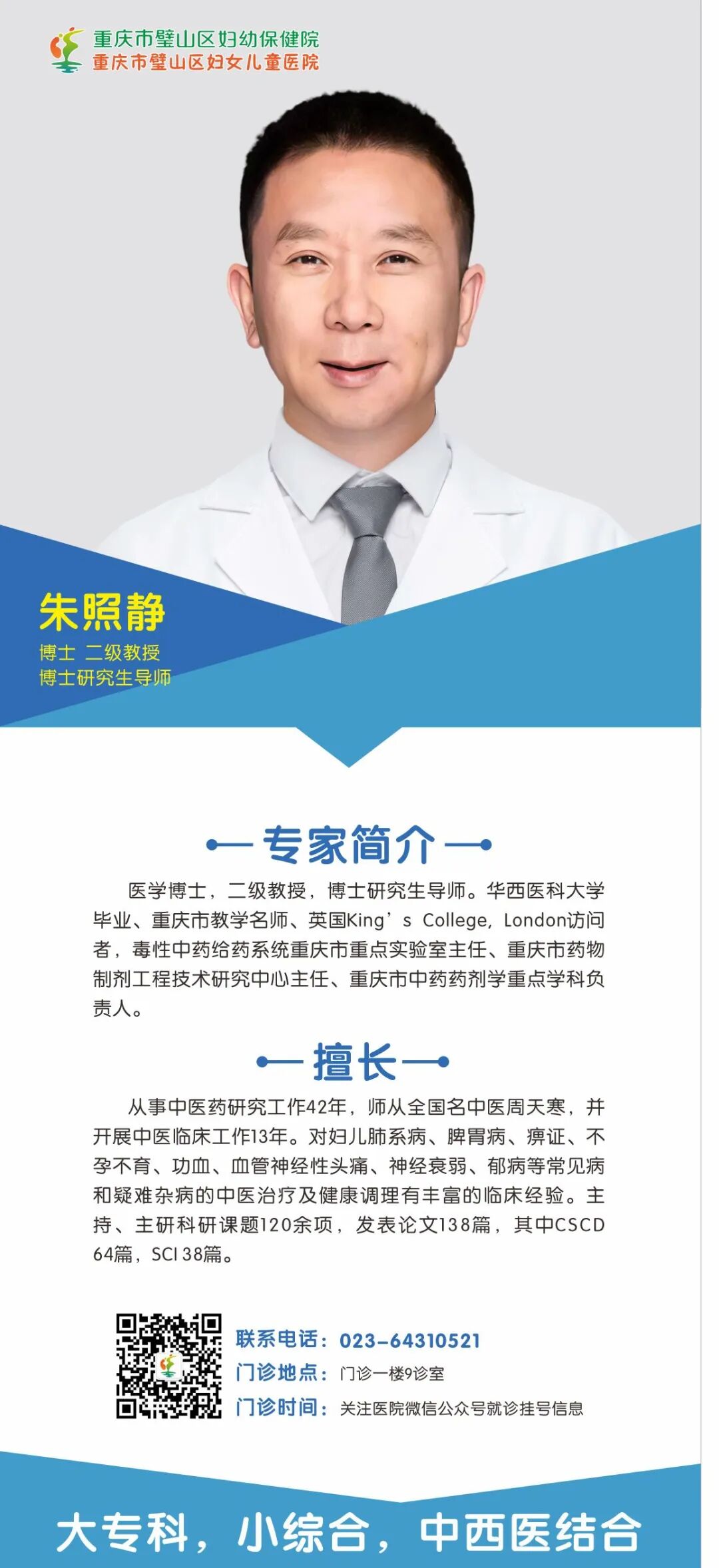 坐诊时间:每周三上午8:00-12:00(若有调整见医院官网)坐诊地点:重庆市璧山区妇幼保健院一楼中医诊室二(名中医工作室)预约电话:023-64310521网上挂号:关注重庆市璧山区妇幼保健院微信公众号->就诊信息挂号缴费一>门诊挂号一挂当天号/预约挂号一>选择就诊人一中医科朱照静->-楼中医诊室二就诊。