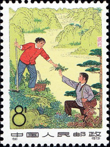 金银花是民间随处可见、唾手可得的药材,是我国一种具有悠久历史的常用中药。1974年6月26日,国家邮电部发行了《赤脚医生》邮票一套四枚,其中“采药”邮票中描绘了两名女赤脚医生背着药筐,拿着锄头,在山坡上采摘金银花的场景。