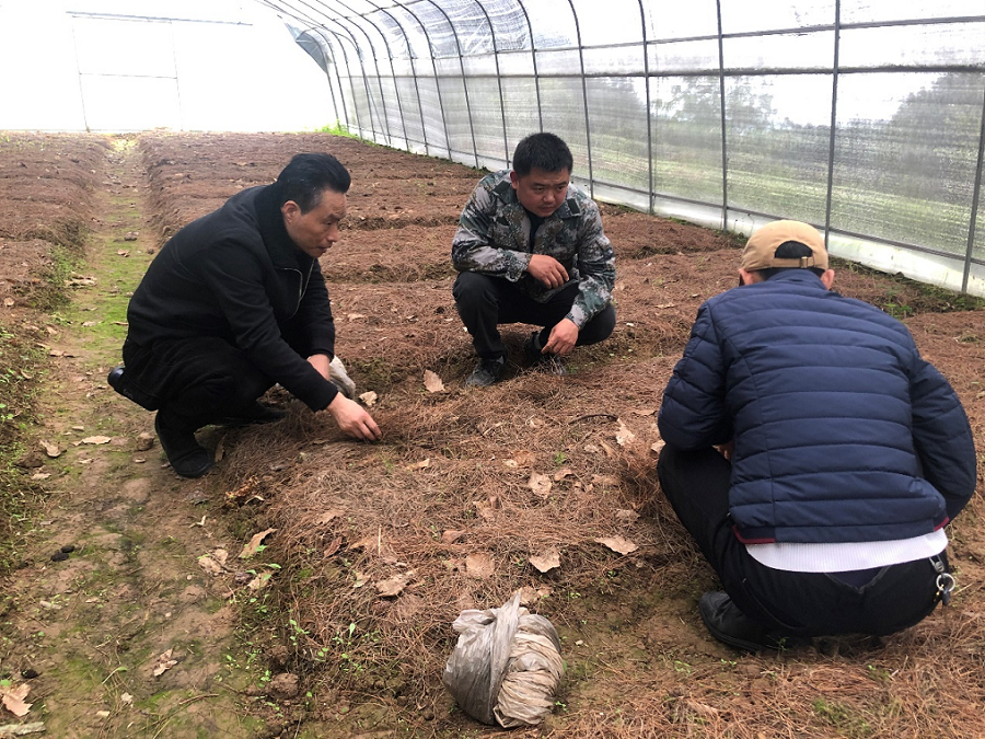 3月31日,副所长李品明带领药研所淫羊藿研究团队成员杨毅等专家赴丰都县许明寺镇梨园村淫羊藿种植基地开展技术指导。在丰都县张磨山农业开发专业合作社淫羊藿种植基地就淫羊藿规范化栽培、种苗繁育关键技术、林下种植要点等方面进行了现场指导。团队成员先是在林下种植地观察淫羊藿长势,叶片健康状况,以及遮阴情况,提出栽培管理的相关建议。接下来又到种苗繁育大棚内查看淫羊藿出苗情况,为种植户讲解播种过程中的关键点和后续管理过程中的难点。