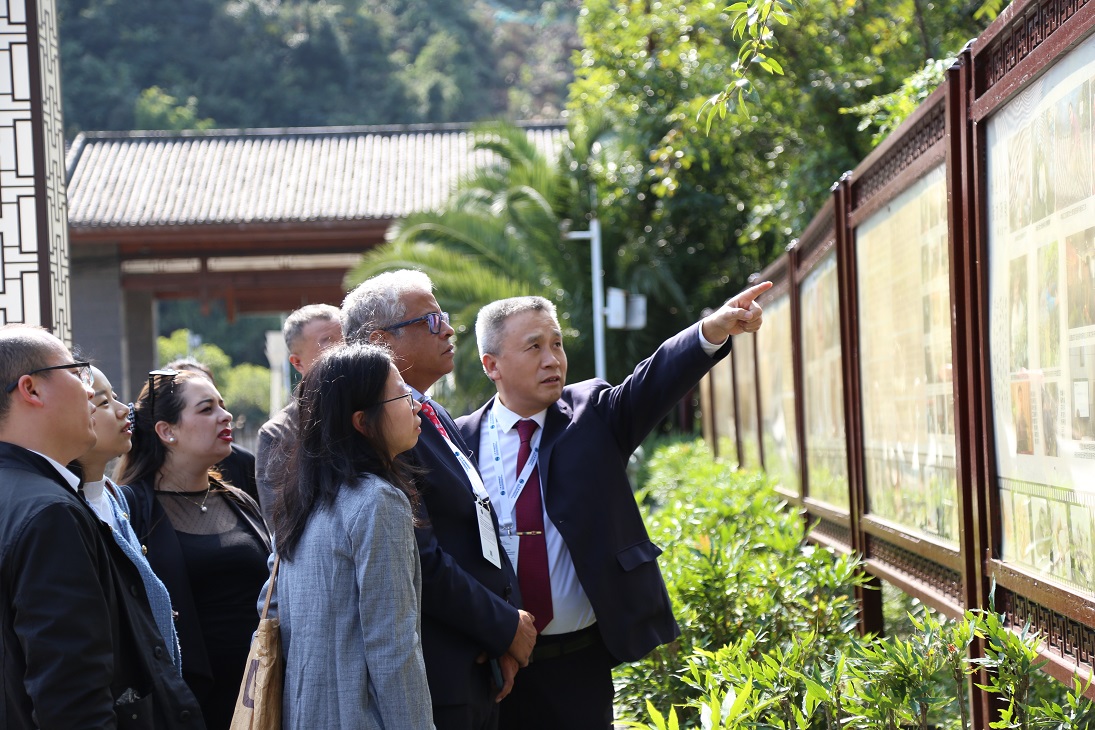 摩洛哥代表团一行依次参观了神农广场、时珍长廊、本草苑、药用植物园、思邈广场、生药标本室、腊叶标本室等。所党委书记雷治政详细地介绍了我所发展历史、科研成果、金佛山特色中草药、中医药科技创新、大健康产品研发等情况。亚辛·扎格洛尔校长及乌拉亚·舒艾处长对药用植物非常感兴趣,全程认真聆听,还在留言簿上写下了真挚的祝福。座谈会上,亚辛·扎格洛尔校长表示,通过参观考察,他对我所专家们的科研成果感到敬佩,也认识到了药用植物的神奇魅力;他认为:中医药在全世界都很著名且效果显著,是全人类的宝藏,研究所的成果为全世界人民做出了贡献。同时,他对我所的热情接待表示感谢,并希望能与我所保持友好关系并加强交流合作。杨勇同志对摩洛哥代表团一行的到来表示热烈欢迎。他希望双方建立沟通协调机制,进一步加强科研及人才交流合作,不断推进中医药文化国际化传播。