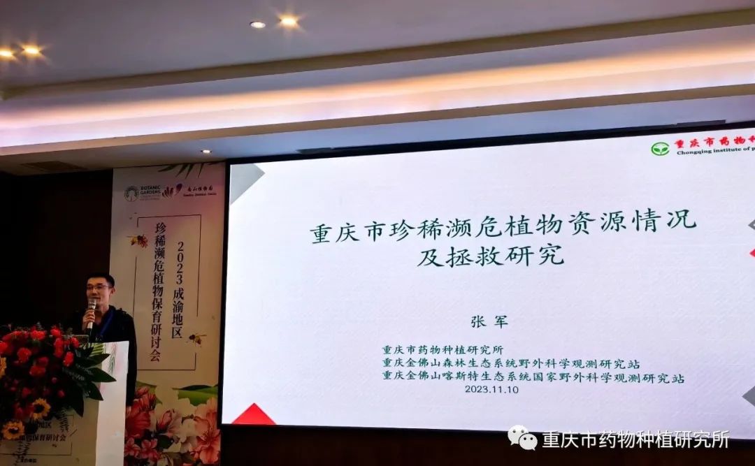 2023年11月9日—11日,“2023成渝地区珍稀濒危植物保育研讨会”在重庆市南岸区塔宝花园酒店召开。我所所长杨勇,中药资源中心主任张军研究员、药用植物园主任任明波受邀参加了此次会议。张军研究员在会上作了“重庆市珍稀濒危植物资源情况及拯救研究”的报告。
